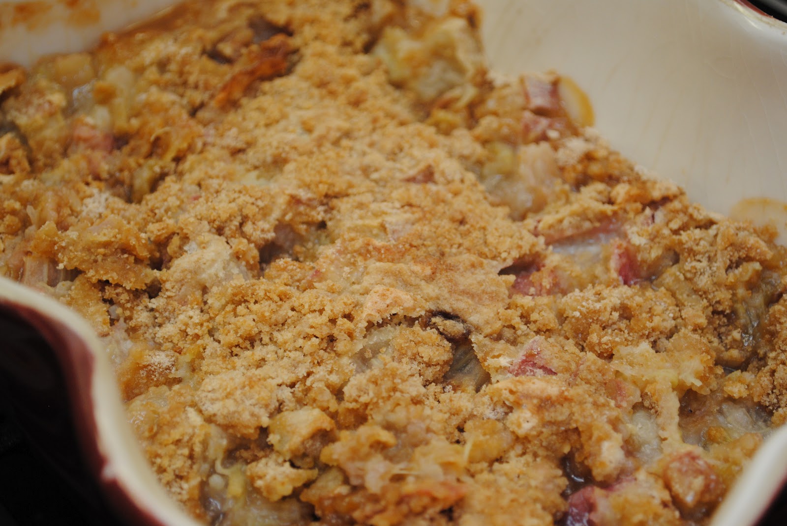Then we made a crumble topping by creaming brown sugar, flour, and butter and sprinkling it on top of the rhubarb mixture.